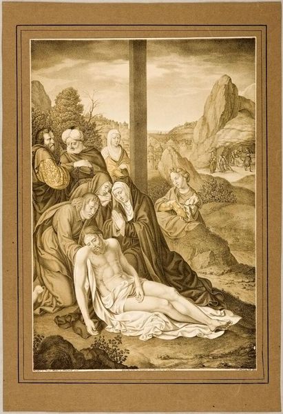 Curator: Claude Mellan's "Dead Body of Christ Extended on the Tomb" is a profoundly moving print. I'm immediately struck by the dramatic chiaroscuro and the raw emotionality conveyed through the figures’ postures. Editor: Indeed, the printmaking technique here is fascinating. The very lines on the copper plate, the labor to create them, echo the suffering in the story. Mellan chose to depict a subject laden with sorrow, but the means of production lends another layer. Curator: Absolutely. Mellan's technique, reducing volume to a matter of pure contour, elevates the suffering, emphasizing form and the linear rendering of light. Mary's pose is particularly compelling, almost mirroring Christ's own horizontal extension, amplifying the scene's emotional gravity. Editor: The materials themselves—the paper, the ink, the press—become vessels holding not just the image but the physical effort, social setting, and artistic skill required to produce the piece. This adds to the poignancy, doesn’t it? Curator: It does indeed. The engraving masterfully distills the essence of grief into a study of light, shadow, and line. Editor: Knowing the process and effort, it seems less about idealized form and more about what tangible human labor can represent. Interesting how the materials and process deepen the emotional impact.