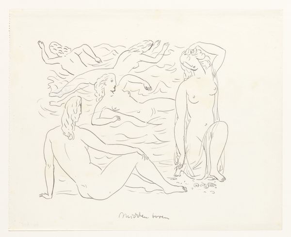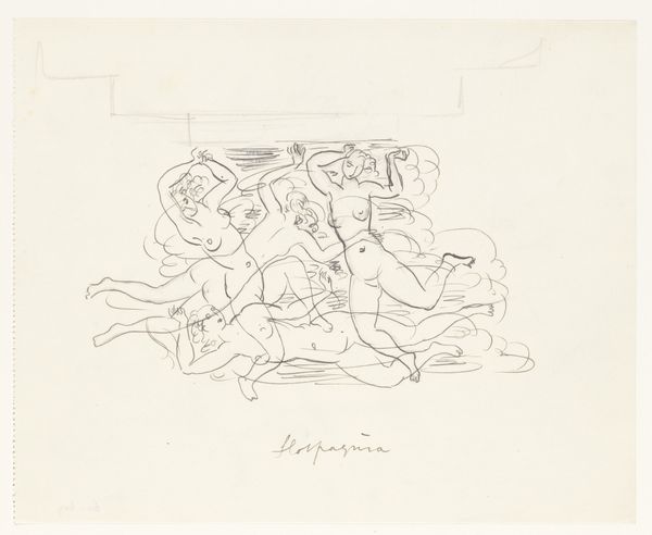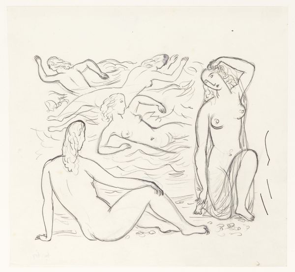 Leo Gestel created this drawing, titled "Naakte vrouwen, zwemmend," using graphite on paper. The medium itself, a humble pencil, emphasizes the artist's hand and the immediacy of the creative process. Gestel's choice of graphite allows for a range of tones, from light, airy sketches to more defined lines, capturing the figures' movement and weightlessness. The paper's surface, though plain, provides a crucial ground for the composition. The visible pencil strokes and unfinished quality invite us to consider the act of creation. The drawing has a sketch-like quality, but this is misleading, as the production of graphite pencils in the early 20th century speaks volumes about the industrialization of art production. Gestel’s playful, sensuous scene is a direct result of mass manufacture. It is a reminder that even the most seemingly spontaneous artworks are embedded in a network of labor, politics, and consumption. Appreciating the materials and context of "Naakte vrouwen, zwemmend," enriches our understanding of the art.