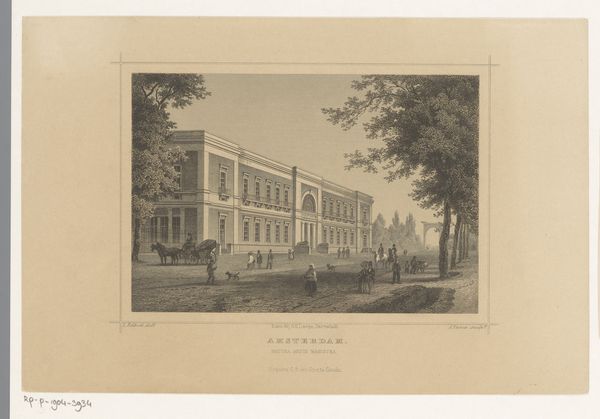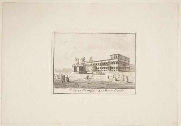 Editor: Here we have Jean-Baptiste Arnout's 1820 engraving, "View of the Hôtel de la Marine from the Tuileries Terrace." It's a rather stately cityscape. Something about the muted tones and careful rendering of the architecture gives it a very formal, almost aloof, quality. What's your read on this piece? Curator: Aloof is a great word. It feels very considered, very much about capturing a specific moment of civic pride and order. It's like looking at Paris through the lens of Neoclassical ideals, wouldn’t you say? There is such calm to it, and a real embrace of classical proportion, with those meticulous engravings defining the buildings’ structures. Do you see how the artist employs a certain atmospheric perspective to push back the distant skyline, too? Editor: Definitely, that sense of distance is key. And, the way the figures are included – almost as afterthoughts. Curator: Precisely! They are merely staffage, tiny representatives, really, of humanity's presence rather than the subject itself, in contrast to the dominating architecture. Think of the grand narratives, the empires of the era… The H\u00f4tel de la Marine, with its impressive façade, speaks to a sense of unwavering permanence and power. Almost like a stage. It does, doesn't it? Editor: I see what you mean! So, it's less about the individuals and more about the stage upon which they act? It’s history being made, or *about* to be made. Curator: Absolutely. The city itself is the protagonist here, forever etched in time, unyielding, observing… and the passers-by, bless them, are simply momentary actors on this glorious, architectural stage. A humbling thought, eh? Editor: It is. I never would have looked at it that way on my own. I was too focused on the building itself. Now I realize how every element contributes to this… this sense of enduring civic identity.