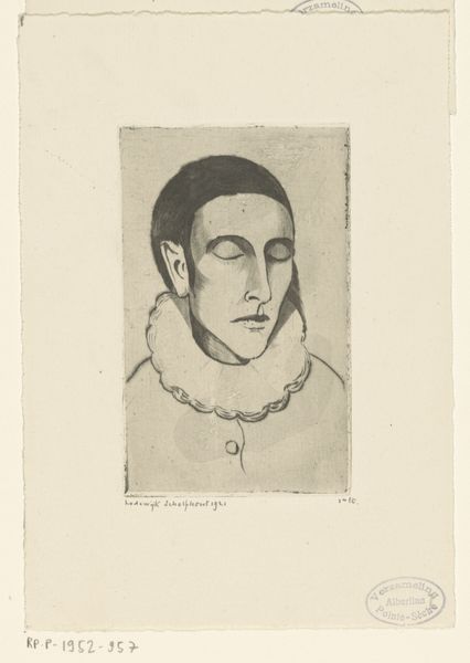 Editor: So, this is Lodewijk Schelfhout’s “Pierrot,” dating from between 1891 and 1943. It’s a charcoal drawing currently held in the Rijksmuseum. I’m struck by the melancholy—he looks so world-weary. What do you see in this piece? Curator: It whispers stories, doesn’t it? Pierrot, the eternal sad clown. But look closer, it is not only the obvious sadness. His eyes are closed—a voluntary shutting out? What secrets are hidden behind those closed lids? Schelfhout beautifully uses charcoal to give the image a dusky quality, but if it’s despair, it's also an elegant despair, you know? It’s like a faded photograph, a memory clinging to life, wouldn't you agree? Editor: That idea of voluntary shutting out is interesting. The dramatic ruff and the somber palette really enhance that feeling. The symbolism almost feels… theatrical. Curator: Theatrical is spot on. Pierrot himself *is* theatre, isn't he? Always acting, even in his supposed solitude. Do you think Schelfhout saw Pierrot's sadness as performance or authentic emotion? Editor: I lean towards authentic. The averted gaze feels too vulnerable for it to be just a show. I wonder if Schelfhout was reflecting his own vulnerabilities? Curator: Ah, that’s a lovely question. Perhaps Pierrot became a mirror, reflecting back something deeply personal, as good art so often does. The universal melancholy is always close to home, isn't it? Editor: Definitely. I came in seeing a sad clown, but now I'm seeing a hidden self-portrait. It makes it much more resonant. Curator: Exactly! And that, my friend, is the magic of art. To peel back the layers and find the truth – or a truth – hidden beneath.