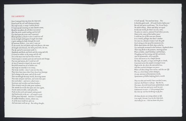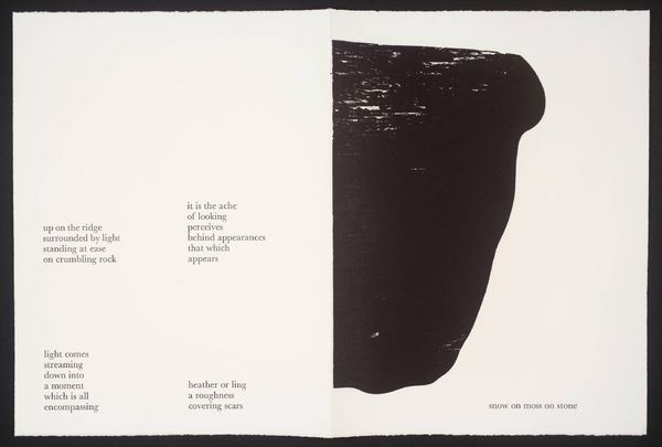Curator: Here we have an untitled work by William Johnstone. Look closely—notice how the ink is delicately yet forcefully splattered across the page, almost like an explosion frozen in time. Editor: The poem on the right page titled "The Late Wasp," certainly contextualizes this visceral imagery as a narrative of decline. It speaks to the individual and the environment confronting the inevitable passage of time and change, echoing the artist’s own life and historical events. Curator: Indeed, the composition, juxtaposing the stark visual elements with the poem, achieves a striking sense of balance. The inky blots contrast the poem's crisp, deliberate typography. Johnstone masterfully uses emptiness as a compositional element, framing both image and text. Editor: Seeing this, one cannot help but ponder the sociopolitical contexts of Johnstone's time, living through major wars and cultural shifts. The wasp, in its fading existence, becomes a metaphor for resilience amidst despair, questioning prevailing societal structures and power dynamics. Curator: The starkness of the black ink against the pristine white paper produces a stark visual tension, mirroring the poem's themes. It evokes a feeling of melancholy, of beauty found in decay. Editor: I find it a profound reflection on mortality and perseverance. It inspires us to consider how we confront our own vulnerabilities, as individuals and as a society.