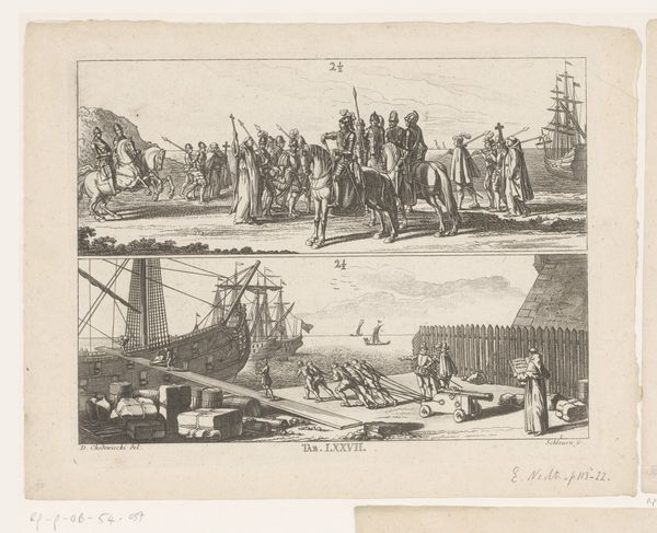 This print, Géleanor ontscheept in Mauretanië, was made by Claude Mellan in the 17th century through the process of engraving. Mellan was a master of the burin, the tool used to make engravings. Here, he’s incised lines onto a copper plate, manipulating the pressure to create varied depths and widths. This creates an intricate pattern of light and shadow. The image depicts a scene of arrival and conquest, with ships anchored offshore and soldiers lining the beach. What interests me most is the labor involved. Every line represents a deliberate mark, a moment of focused effort. The engraver must have been acutely aware of the relationship between labor, tools, and representation. Such prints were relatively democratic. Compared to painting or sculpture, prints allowed for wider dissemination of images and ideas. Mellan's technical virtuosity elevates this print beyond mere reproduction. It becomes a testament to the potential for craft to express complex social and historical narratives.
