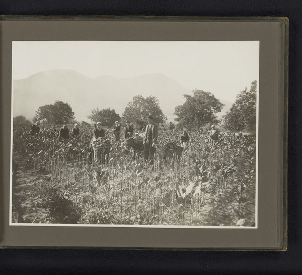 Curator: At first glance, this image conveys a somber feeling; it's vast and monotone, depicting women toiling in a field. What details can you discern? Editor: Indeed. The photograph, a gelatin-silver print made sometime between 1925 and 1928 and titled *Vrouwen op de akker*, which translates to 'Women in the field', presents a muted palette. The eye is immediately drawn to the horizontal band of women, their figures evenly spaced, almost regimented within the expansive field. The composition directs focus on their labor in this landscape setting. Curator: Their presence, evenly distributed yet isolated within their labor, reminds me of archaic ideas surrounding womanhood connected with land cultivation; the symbolic power in this is very potent. Does the land itself speak to you at all? Editor: Structurally, it reinforces a sense of both repetition and recession. The women are mirrored by the small hill range in the distance, creating echoing, similar visual masses, connected with implied labor. Curator: That resonates deeply. The image has a subtle undertone. I also notice each woman is slightly bowed over, and with their faces cast in shadow they lack a sense of self beyond the labor at hand; they appear to be almost faceless. What could be at the root of this kind of visual representation? Editor: The contrast between the earth's darkness and the lightness in the sky pushes these human elements to a more shadowed reading as well. They almost become shapes of their clothes as much as unique humans themselves, giving the figures a certain gravity of mass in tone alone. Curator: Right; this echoes age-old portrayals depicting women's collective destiny inextricably tied to the earth's rhythms and demands. Each woman blends seamlessly within their landscape, yet somehow remains distinct with slight changes in form—but they are not entirely independent from one another either. There’s this push and pull within group association. Editor: Precisely. Looking again, that constant interplay creates that striking tension that grabs our interest in the picture overall. Curator: Well said. Thanks for the image clarification!