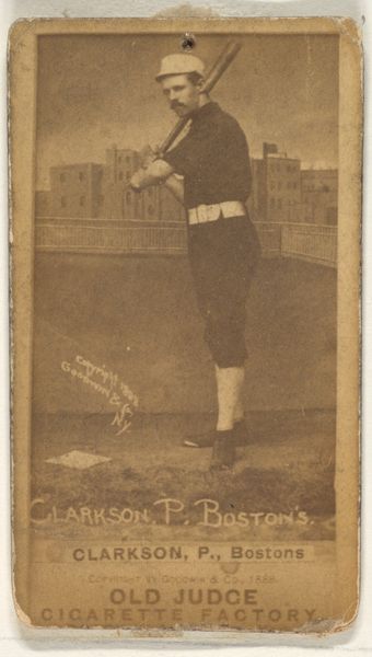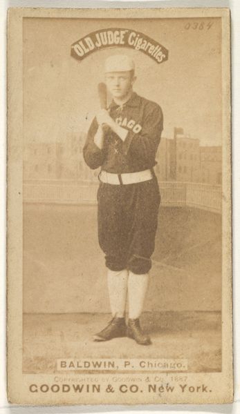 Editor: This lithograph, "Tom Daly, Catcher, Chicago," created in 1887 by Goodwin & Company, feels so simple. Just a ballplayer on a small card used for marketing Old Judge Cigarettes. How should we interpret it? Curator: Focus less on interpretation, and more on production. This lithograph isn’t just about baseball, it’s about the means of making and distributing images in the late 19th century. We must consider the materials—the paper, the ink, the lithographic stone. These baseball cards functioned as a commodity, distributed alongside another commodity: cigarettes. How does that relationship shift our understanding of the image? Editor: So, it's not about Daly, or even baseball really, but the commercial forces at work? Curator: Exactly. Consider the labor involved in each step—mining the materials, manufacturing the paper and ink, the lithographer’s skilled work. And it’s all tied to the consumption of cigarettes. This seemingly simple baseball card implicates a whole chain of material production and distribution. Editor: But how does the aesthetic factor in, though? Curator: The aesthetics reinforce the commodity status. The pose, the player’s name—it’s all designed to be collected, traded, and consumed as part of the Old Judge Cigarettes brand experience. Think about who had access to it? Was it aimed towards the working class, who also played baseball? Editor: Right, because smoking wasn't as stratified economically back then, meaning that this card had much wider audience, socioeconomically. So it challenges traditional notions of art by democratizing it across a broader consumer base, interesting. Curator: Precisely. It challenges us to look beyond the surface and see the network of materials, labor, and capital that brought it into being. It pushes the definition of art into one based on materiality, not genius. Editor: That's given me a whole new perspective. I hadn't considered it as a document of industry itself. Curator: Indeed, we see that its value resides in its complicated production process, rather than its surface depiction.