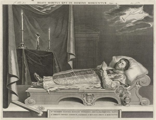 Curator: Vittore Carpaccio, a name synonymous with the Venetian Renaissance, completed "Dream of St. Ursula" in 1495 using tempera on wood. This piece, currently housed in the Galleria dell'Accademia in Venice, is one of a series depicting the life of Saint Ursula. Editor: It feels incredibly intimate, doesn’t it? There’s a certain stillness—an almost hushed reverence—conveyed by the cool colors and geometric forms. It's as if we're intruding on a sacred moment. Curator: Notice the artist’s meticulous attention to spatial organization and perspective. The bed acts as a horizontal anchor, juxtaposed with the verticality of the architecture—the windows, the columns. These carefully constructed lines emphasize the interplay of interior and exterior space, giving us a sense of depth. Editor: That careful geometry can also feel oppressive. It makes me consider Ursula's constrained role as a woman within religious institutions. The architecture here imprisons as much as it elevates, representing a world circumscribed by patriarchal forces. Curator: While that may be, structurally, the light is expertly rendered. Consider how it pools on the right side of the composition, drawing our eye to the angel and her ethereal presence. This celestial intrusion doesn't disrupt the space but integrates seamlessly within it. Editor: Yes, but think about who gets to experience these visitations and visions. Throughout history, such "divine" encounters are often depicted as happening to young, unmarried, and often obedient women. Does this reflect true holiness or enforced societal expectations? The passive St. Ursula lying asleep there… is it peace, or a surrender to fate that she has not decided? Curator: Perhaps. But structurally speaking, by using color to link the figures of the angel and the dreaming saint, the artist forges a symbolic chain between earthly and divine realms that is independent of gender constructs. Editor: Ultimately, the visual power resides in how this image complicates our reading. It leaves one contemplating questions of faith and authority without offering any easy answers. It is a snapshot into a particular woman’s dilemma – even now, centuries on. Curator: A very good observation. This focused encounter truly blends formal elegance with deep, perhaps irresolvable, complexity.