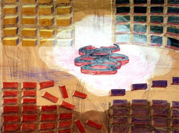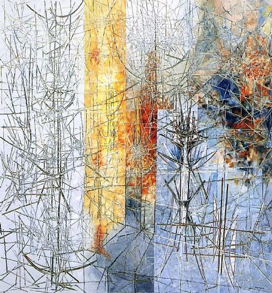 Jimmy Ernst made this enigmatic painting, Equations, with oil on canvas. Look how the surface shimmers with layers of delicate, web-like lines. For me, this is what painting is all about - a process of layering, building up textures and colours until something unexpected emerges. The painting is divided into distinct areas, each with its own character. The left side features cool blues and greens, crossed by bold, black lines, like looking through a window into another world. Then your eye hits the panel on the right, a vibrant mix of reds and oranges, again with those intricate webs of black lines creating a sense of depth and complexity. I’m especially drawn to how Ernst manages to create such a tactile surface with such delicate marks. This reminds me a little of Agnes Martin's work, with their shared emphasis on line and subtle colour shifts, but Ernst's painting has a darker, more mysterious quality. Ultimately, this piece is about the act of seeing, inviting us to explore the many possible equations of colour, line, and texture, and the endless conversations that happen across time.