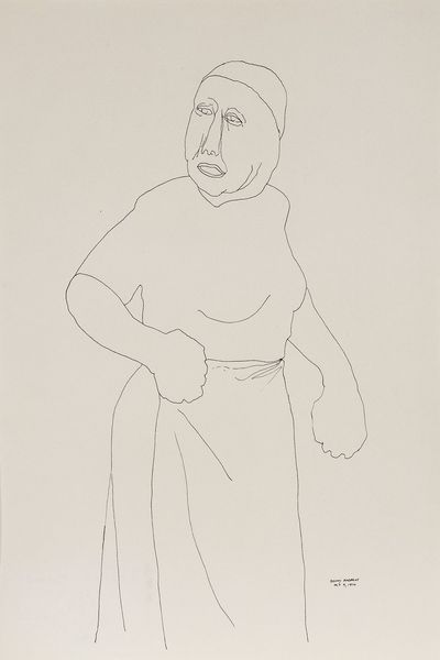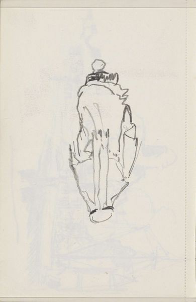 Curator: Here we have Benny Andrews’s 1970 pencil drawing, “Cargo (Study for Symbols).” Editor: The rawness of it gets me. It's just bare lines on paper, like a half-remembered dream etched quickly before it fades completely. Curator: I see it too. Andrews has this amazing knack for capturing really complex social commentaries in what look like simple forms. It's a study, an idea—and ideas, like feelings, aren't always neatly packaged. Editor: Definitely. The tilted stretcher bearing an unsettling flag design… it evokes this very specific sense of displaced patriotism. Like, what are we carrying? What’s the real “cargo” here? The symbols almost mock the solemnity you might expect. Curator: That image on the flag really gets to me. Stars and...is that supposed to be Uncle Sam’s head, maybe? Disfigured? There’s an incredible tension between the seeming nonchalance of the drawing style, its sparseness, and the weighty theme of national identity under duress. Editor: There’s such vulnerability in the faces too. They’re not idealized figures, are they? It feels so immediate. And that blank space above, weighing down on everything below—heavy silence. Curator: And yet, there's a sense of movement. These men aren't statues. They’re bearing something. The title makes it sound like necessary baggage, maybe—a necessary, awful responsibility. I’d like to see that sketch be part of a finished painting someday. Editor: Agreed. It’s haunting and the more you observe it the more emotionally taxing it seems, not because it demands that you feel this or that, but it stirs in you many questions. Andrews’s raw strokes expose the bones beneath our culture, don’t they? Curator: They do indeed. Even unfinished, there's such a depth. It's less about finding answers, and more about sitting with those troubling questions together.
