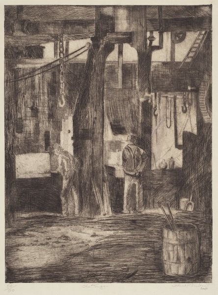 David Young Cameron made this etching, Robert Lee's Workshop, capturing a space that feels both intimate and expansive. Look at the way he uses line – so delicate, almost hesitant in places, then bold and decisive in others. For me, that's the magic of printmaking; the artist's hand is so present, even though there's a whole process involved. The texture Cameron achieves is incredible. See how the light catches on the rough-hewn wood? It's like he's not just showing us a workshop, but also the history embedded in these materials, the marks of labor and time. The dark space in the background draws you in, and the ladder, oh, that ladder! It's almost like a visual metaphor, connecting the earthly with the unknown. Think of Whistler's etchings, and how he also managed to create these moody, atmospheric scenes with such economy of line. Ultimately, art is a conversation across time. It’s not just about what we see, but how we feel, and what memories and associations the image stirs up within us.