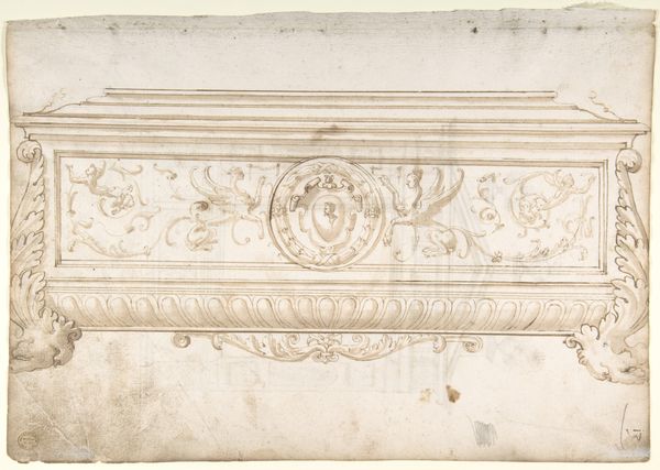 Curator: The artwork presented before us is a "Design for Andirons," created between 1770 and 1795 by Jean Louis Prieur le Jeune. It's currently held at the Metropolitan Museum of Art. It feels like such a measured, formal design. What can you tell me about how we might interpret such an image? Editor: What strikes me first is the bilateral symmetry and clean lines. The rendering is so precise. What do you see when you look at it from an art perspective? Curator: Considering its intrinsic qualities, let's observe how Prieur utilizes form. The geometric components—cubes, cylinders, and spheres topped by what appear to be stylized pineapples—are rendered in a way that suggests mass, stability. Editor: How do the lines influence that sense of stability? Curator: The linearity dictates the clarity of form; note the precision of each contour. We see how he carefully modulated tonal values to depict shadow and volume. These formal choices, I believe, are crucial to appreciating the design's architectural integrity. Do you see what I mean? Editor: Yes, absolutely. It is fascinating how the design, while relatively simple in its components, creates a complex visual experience due to the precision of line and shading, which adds such depth to a rather restrained work. Curator: Precisely. Prieur masterfully orchestrates these basic geometric units into a visually harmonious design. Note the proportional relationships between the base, the central panel, and the crowning elements. The linear elegance speaks to a careful consideration of neoclassical ideals. Editor: It’s like a miniature architectural study, all about proportion and form. I hadn’t really considered it that way at first! Thanks. Curator: Indeed. Thinking through this approach has changed my perspective too!