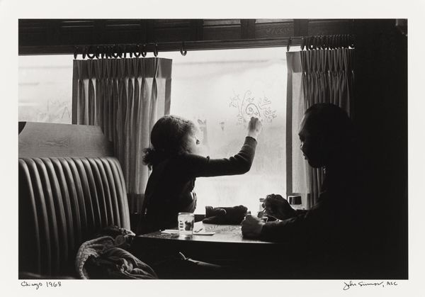 Curator: This is a powerful, untitled image by Tracey Moffatt, part of the Tate Collections. It measures roughly 61 by 76 centimeters. Editor: It strikes me as melancholic, almost haunted. There's this tender domestic scene juxtaposed with something stark and unsettling outside the window. Curator: Precisely. Moffatt's work often explores themes of identity, race, and the complexities of Australian history. The outside world, with those figures who seem like nuns, presents a stark contrast to the interior, potentially symbolizing the oppressive forces impacting Indigenous lives and families. Editor: The dilapidated room, the graffiti on the window, all suggest a sense of neglect, perhaps systemic neglect. Is Moffatt suggesting something about the stolen generation, or the forced removal of Indigenous children? Curator: It's certainly a reading supported by the visual cues and Moffatt's broader body of work. The tenderness of the mother holding the child is both beautiful and deeply painful when seen through this lens. Editor: It’s a poignant reminder of how personal narratives are often intertwined with broader socio-political realities. Curator: Absolutely, and Moffatt’s use of staged photography makes us question the constructed nature of these realities, and of our understanding of history itself.