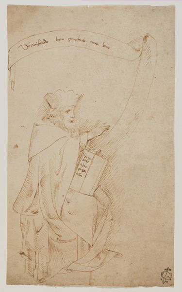 Curator: This is Federico Zuccaro’s "A Swiss Guard," a drawing rendered in ink and watercolor on paper sometime between 1571 and 1635. Editor: He looks rather… flustered? Is it hot in here, or is it just the heavy ruff collar? I sense a bit of Renaissance drama simmering beneath the surface, despite the sepia tones. Curator: Indeed. Let’s consider the Swiss Guard during that period. Often, these individuals represented more than mere soldiers; they became symbols of political power and religious authority within a fractured Europe. Editor: Makes sense. There's a grid behind him, almost like a backdrop on a stage. Do you think he was in the middle of something when Zuccaro captured his image? Like maybe, interrupted mid-speech? Curator: The grid is an under-drawing for a more finalized painting, used for scaling and proportion. But regarding the Guard's persona, you might be on to something. His gesture with the hand suggests a state of discourse. Swiss Guards had become entrenched in diplomatic relationships beyond their purely military applications. Editor: The little details! I didn't realize just how ornate his clothes are; almost too grand. A signifier of social status. All I can imagine is him constantly worried about getting a spot of marinara on his doublet. Curator: That's an interesting contrast, yes: splendor versus pragmatism. Swiss Guards weren't necessarily noble, per se. So the visual representation, intentionally rendered to indicate rank, speaks volumes regarding self-fashioning in Early Modern Europe. It also reflects the strategies rulers deployed, appropriating imagery and visual vocabulary to communicate prestige through various channels. Editor: It almost seems as though his image has become more about symbolic communication of authority, rather than just an attempt to represent the man himself. Food for thought, certainly. Thanks for this new way to understand it. Curator: Indeed. Considering those strategies might afford us new inroads to art of that period, understanding that a painter like Zuccaro had an acute comprehension of how visual language informed the public sphere. Editor: Absolutely! Gives the whole work a fascinating double-layered edge to consider as one moves through the rest of the exhibition.