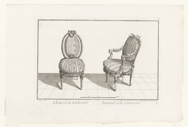 Curator: Here we have a print from between 1745 and 1775, titled "Twee stoelen," or "Two Chairs," currently residing in the Rijksmuseum collection. Editor: They look a bit severe. Perhaps it’s the linear quality of the engraving, but there's a crisp, almost diagrammatic feel that counters the obvious Rococo curves of the chairs themselves. Curator: Precisely! The print employs a highly structured visual language to depict these Baroque chairs. Observe the lines – clean, definitive. They delineate form with an almost mathematical precision, a directness typical of the engraving process. The composition, divided neatly in two, emphasizes the chair's structure and design. Editor: Yes, and knowing this was created as a reference for sculptors and upholsterers re-contextualizes everything. This isn't just about appreciating beauty; it's about the practical matter of design and the labour involved in recreating such intricate forms. It shows the chairs less as aesthetic objects and more as products of specific materials and skills. Curator: It becomes an almost pedagogical exercise. Notice how each element—the curvature of the legs, the floral details—are carefully articulated, creating a visual taxonomy of chair design. It guides the artisan in understanding and replicating the intended style, encapsulating Baroque ideals in an accessible, functional format. The lines act almost as an architecture of intent. Editor: Considering the social context of furniture making, each chair implies a history of resource extraction, workshops filled with artisans, the specialized skills of carving wood and weaving textiles. This engraving is less a celebration of the finished product and more a window into the complex web of production. I wonder what kind of wood or textiles would have been available? And the training required to execute that level of ornate carving? Curator: Your observations illuminate the fascinating tension here, the juxtaposition of art as visual instruction against the social dynamics inherent in the chair's production. It prompts us to look beyond the mere elegance of form, to analyze it not just aesthetically but almost semiotically. Each component signifies not only the style but also the socio-economic networks involved in bringing it into being. Editor: Precisely. Looking at these chairs anew, I can’t help but appreciate the material realities underpinning their design. It challenges me to think critically about value—not just the artistic kind but the social value embedded in every stage of an object's creation. Curator: A compelling point. Considering "Two Chairs," we appreciate the formal interplay of line and form while acknowledging the object's connection to a broader material existence.