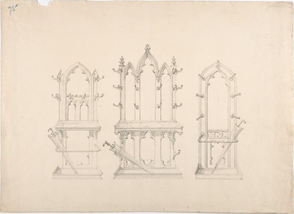 Editor: This is “Design for a Gothic Cabinet,” a drawing by Charles Hindley and Sons from the late 19th century. The intricate details sketched in pencil and etching are just astonishing. The design reminds me of a church altar. What historical elements stand out to you in this piece? Curator: Considering its place in history, the Gothic style suggests a revivalist movement, where Victorian-era designers looked back to medieval aesthetics. The use of such a style speaks to a desire to imbue domestic spaces with a sense of history and perhaps even moral authority, something they thought was getting lost as society industrialized. It brings up the question of who this design was intended for and what messages they wanted to send by showcasing such a cabinet. Editor: That’s a good point. Was this "Gothic" aesthetic purely decorative or was it also functional? Curator: These cabinets would have certainly been statements of wealth and taste, intended for upper-class homes or possibly even public institutions attempting to cultivate a sense of tradition. It evokes how art gets intertwined with politics, particularly cultural politics, through style choices and symbolism. This relates to social status within their environment. Don't you think that design also implies function? What function could that be? Editor: The details suggest maybe books or artifacts... What I'm taking away from this discussion is a richer understanding of how the past is constantly being reinterpreted and re-presented to shape cultural values in the present. Thanks! Curator: And I see how crucial the connection is between artistic intention and society's aspirations. It has been insightful!