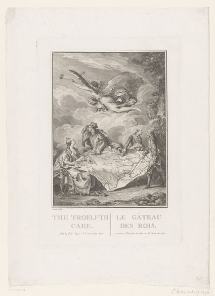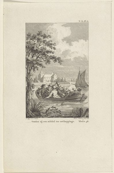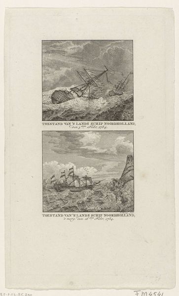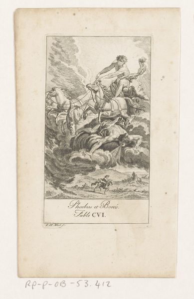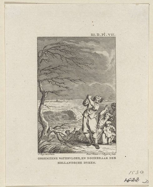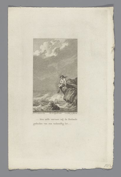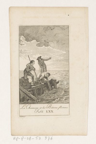 Editor: This etching from 1776, titled "Fabel van de kameel en de drijvende stokken," attributed to Bertin, depicts three figures amidst a stormy seascape. The linear quality and detail are striking, almost photographic in their realism. What do you see when you look at this piece? Curator: For me, this piece is fundamentally about labor and resourcefulness within a specific socio-economic context. The figures are working with wood amidst turbulent seas. Look closely at the rough textures. This evokes the physical hardship inherent in their work and suggests the type of labor present at this historical time. What tools were used, how were they acquired, and what was the process of creation? Those are the more interesting questions that help us contextualize the narrative that unfolds. Editor: So, the social conditions of production are as important as the subject being depicted? Curator: Absolutely! These weren't luxury items; prints like this served to communicate specific messages to a broad audience. By understanding the etching process, the type of paper used, and the dissemination methods, we can understand the function and impact of this image and understand this genre of ‘print’ in society. The choice to depict manual labor, especially amidst nature’s power, likely aimed to resonate with contemporary social and economic anxieties. Editor: That’s fascinating, it really shifts my perspective. I was focusing on the ‘story’ of men and a camel! Now, the material aspect really strengthens that message. Curator: Exactly. Think about what the existence of 'line' entails... it is material, graphic, physical... it comes from somewhere. When you think like that, this artwork can say much more! Editor: I'll never see art the same way again! Thanks.