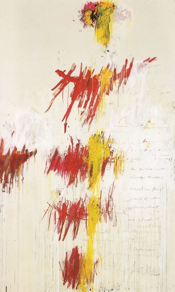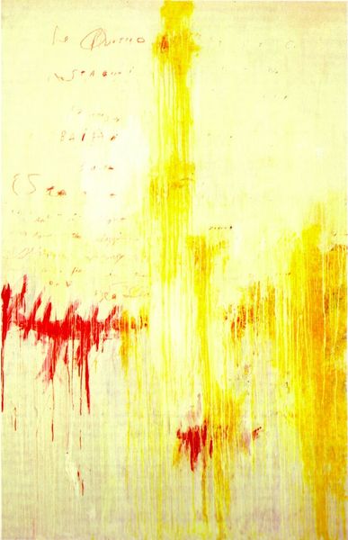 Editor: At first glance, it's as though light itself is taking shape here, a radiant outburst rendered in yellow and dissolving into an ethereal ground. Curator: We are currently observing Cy Twombly's "Coronation of Sesostris", completed in 2000. Executed in acrylic paint, this piece manifests elements of abstract expressionism, and notable impasto application techniques. Editor: "Coronation", huh? The title feels deliberately ironic, juxtaposed with what appears to be an exercise in pure gesture, and color, devoid of traditional symbolic devices usually related to power. What about the production methods here? Curator: Certainly, Twombly challenges representational conventions by foregrounding materiality and technique. Note the fluid drips and layered scumbles. His handling of paint serves as a metaphor for ephemerality, questioning the stability of historical narratives. I should like to focus on that, how does the application itself give meaning? Editor: Thinking about the actual application – look closely. The materiality reads against your idea of ephemerality, I believe. The surface seems aggressively reworked, scrubbed, and smeared, so it is not a stable crown but a laborious palimpsest. I consider it closer to craft than to the history. Curator: Your point resonates regarding the tension. The deliberate awkwardness, combined with that palatial golden colour, further amplifies this reading. The effect is intentionally jarring, forcing the viewer to reconcile perceived value with raw materiality. This contradiction functions semantically. Editor: Perhaps he sought to demystify authority? By revealing the labour, he undermines the spectacle of crowning moments. So he shifts meaning production to materials rather than, let us say, classical motifs. Curator: Agreed. The very act of deconstruction becomes a powerful tool, compelling one to reconsider embedded beliefs that so many other historical moments demand unquestioned. Thank you for the interesting take. Editor: The delight is mine. By tracing gesture we may learn history in tactile mode.