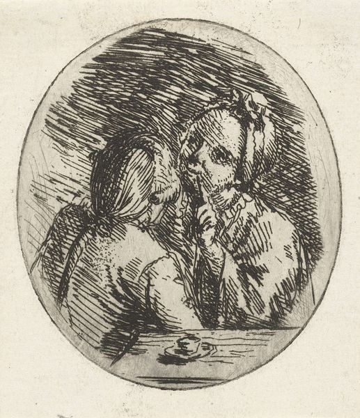 Curator: This print captures an interesting dynamic. It's "A schoolgirl and her music teacher looking at a sheet of music," a piece attributed to Joseph Wagner, dating roughly from 1725 to 1780. It's currently residing at the Metropolitan Museum of Art. Editor: My first impression is one of quiet contemplation. The light falls softly on their faces, highlighting the focused gazes of both the girl and her teacher. It feels very intimate, almost as if we're intruding on a private lesson. Curator: Indeed, the tonal gradations, achieved through meticulous etching, create a sense of depth and intimacy. Notice how the artist uses cross-hatching to build up shadows, particularly around the teacher’s face and turban, which adds to the tactile quality of the print. Editor: And the relationship it portrays is fascinating. Is the teacher merely instructing, or is there something more happening between these two figures, particularly if we read this image against the societal conventions regarding gender roles during the 18th century? The intimacy certainly allows for interpretation. Curator: A crucial socio-historical viewpoint! While ostensibly depicting an innocent scene of musical instruction, the power dynamics are far from neutral. The teacher, holding a magnifying glass, is in a position of authority but note how he also gazes upon his student's face as much as the musical notes on the sheet. This artistic moment raises pertinent questions about knowledge transfer, access to the arts, and possible flirtations within educational contexts. Editor: Precisely. Furthermore, the print medium itself is relevant. This was an era where printed images played a vital role in disseminating ideas and shaping public opinion. Consider who might have purchased such a print and the meanings they could derive from it. A portrait of a music student would signal a leisured education, in comparison to the lot of most young women in the period. Curator: The use of line and texture also contributes significantly to the artwork’s affect. There is great detail on their facial features. A striking semiotic reading. Editor: On reflection, looking again, what struck me most profoundly, beyond the sheer artistic mastery, is the implicit comment on cultural hierarchies it prompts me to consider: The representation of women in Baroque era prints and its contribution to larger dialogues. Curator: A wonderful reminder of how studying the composition enhances a consideration of art's profound public role in its era!