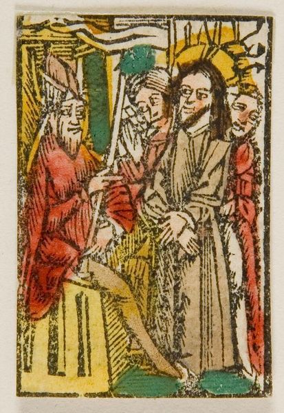Editor: This is "Illustration IV" by an anonymous artist. It looks like a woodcut, maybe with hand-applied color? It's got this medieval feel, and I'm curious about its purpose. What do you see in this piece? Curator: Considering the materials, a woodcut implies a process of reproduction, potentially for mass consumption. How does the act of replicating images impact the perceived authority of the scene depicted and who would have used this? Editor: That’s a really interesting point. I hadn’t thought about the relationship between the image's creation and its accessibility. Curator: The medium itself speaks to the democratization of religious imagery. Think about how this process challenges traditional notions of art making. Editor: Wow, I'm definitely seeing this piece in a whole new light. Thanks for sharing your perspective. Curator: Likewise. It’s fascinating to consider how the means of production shaped this image's cultural function.