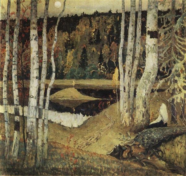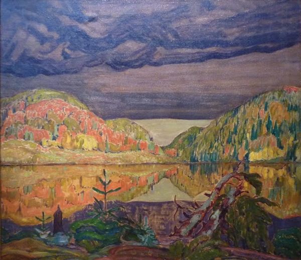 Editor: This is "October Morning, Algoma (Wartz Lake)", an oil painting by A.Y. Jackson from 1920. I'm struck by the stark contrast between the vibrant colors of the autumn trees and the somber, almost desolate foreground. What do you see in this piece? Curator: It's a powerful depiction of transition. Notice the blackened tree trunks reaching skyward. These aren't merely dead trees; they're symbols of resilience after destruction. The landscape remembers the fire, remembers loss, but it also bursts forth with the vibrant colors of life, doesn't it? What does that juxtaposition evoke in you? Editor: I guess it's about nature's ability to regenerate, even after something traumatic. Is that what Jackson was trying to communicate? Curator: Perhaps. The Group of Seven, to which Jackson belonged, was striving to create a distinct Canadian artistic identity. Algoma, with its rugged beauty, became a symbol of that national spirit. So those scarred trees…could they also represent the battles fought to establish Canada's identity? The vibrant autumn a symbol of the country’s potential? Editor: That’s fascinating, I hadn’t thought about a national identity being embedded within the imagery. Curator: Symbols evolve and layers of meaning accrete over time. Those trees carry the weight of past trauma but simultaneously point towards future growth and renewal. Editor: I’ll definitely look at landscapes differently now, recognizing the depth of symbolism embedded within them. Thanks for sharing your insights! Curator: My pleasure. Art invites us to see the world – and our history – with new eyes.