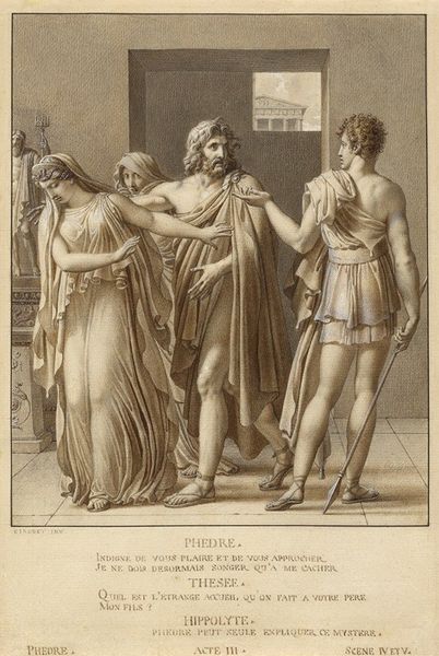 François Gérard created "The Father of Psyche Consulting the Oracle of Apollo" using pen and brown ink, accented with graphite. The monochromatic palette emphasizes form and narrative, typical of the Neoclassical style which favored line over color. The drawing's crisp lines and careful shading evoke a sense of classical sculpture. The process here is all about layering and control. With ink, you can't exactly erase, so Gérard had to work methodically. Look closely, and you see how the pen strokes build up volume, creating a sense of depth on the page. This piece is not just about the subject, but also the skilled hand that rendered it. Gérard's meticulous technique elevates what might have been a simple illustration into a work of art, demonstrating the cultural value placed on the artist's skill and labor during the period. Ultimately, the artist is inviting us to consider the labor and skill involved in its creation, as well as its historical and cultural context.