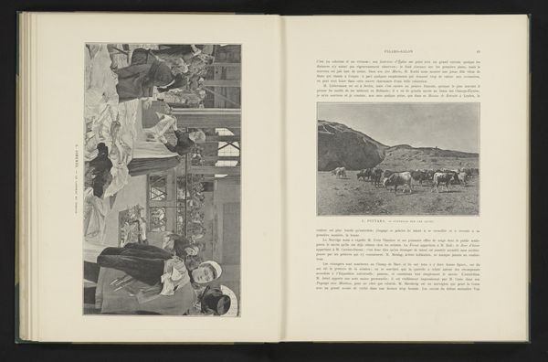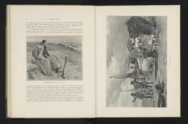 This reproduction of a painting, showing a wedding in Brittany, France, is by an anonymous artist. The scene is bustling with figures, and the mark-making feels really immediate, almost like the artist was trying to capture the energy of the event as it unfolded. It's fascinating how the artist uses tonal variation to create depth and movement, and the monochromatic palette contributes to a sense of historical distance. Looking closely, you can see the way the artist renders the figures. It's somewhere between realistic and abstracted. The brushwork is loose and gestural. I keep coming back to the barrels in the foreground, and the tilted perspective. I wonder if this choice has something to do with the artist’s perspective on marriage, or community. This feels aligned with the work of Honoré Daumier, who was a master of capturing everyday life with both humor and pathos. Art’s an ongoing conversation, right? Embracing ambiguity, leaving room for multiple interpretations.
