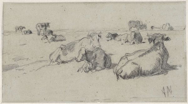 Curator: Let’s turn our attention to this drawing entitled “Drie liggende koeien,” or “Three Lying Cows,” by Guillaume Anne van der Brugghen, made sometime between 1821 and 1889. It’s a pencil sketch on paper. Editor: You know, I love how relaxed they look. Just completely at ease, chewing their cud, lost in their own bovine thoughts. The artist really captured that simple, peaceful moment. It's… pastoral Prozac. Curator: It’s fascinating how van der Brugghen situates these cows. Given its timeframe, we can examine the artwork within the shifting dynamics of agricultural practices and land use, thinking about the cultural symbolism of livestock in Dutch society at the time. The Dutch Golden Age is gone, and romanticism and realism overlap… Editor: Wow, that's...deep. I'm seeing pure zen. They’re practically meditating! I like how loose and sketchy it is; it's like the artist was just hanging out in a field and jotted down what he saw. So direct, you know? It's so down-to-earth...pun intended. Curator: Well, art history provides frameworks for understanding the intersections of social history and artistic representation, but your point about the “zen” quality is insightful. There’s something profound in the simplicity, and we have to recognize this work's participation in defining how society then looked at nature. How were animals seen, represented, commodified? What anxieties may it betray? Editor: Totally! Okay, *and* if we apply some postmodern eco-theory, maybe these cows are critiquing human intervention in the natural world by, like, just existing and being chill about it? Curator: I appreciate your interpretive gesture, linking animal studies to critical artistic practices. Editor: Thanks! Honestly, I'm mostly appreciating the low-key vibes of these cows right now. It’s a good reminder to chill out a little bit. Curator: Absolutely, it invites contemplation. This small pencil drawing carries a weight of history, ideology, and, yes, tranquility. Editor: Agreed. I'm heading to find a patch of grass and maybe a cud of my own now. Thanks for the moo-ving conversation!