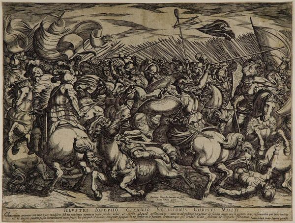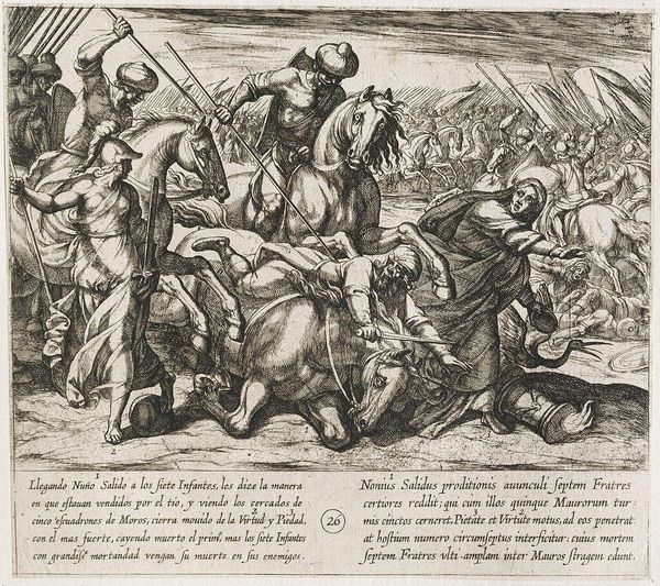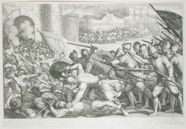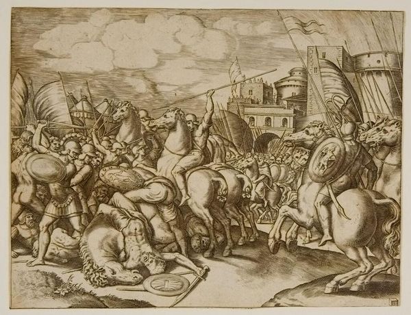 This etching, "Odysseus vecht met de Kikonen," was created by Theodoor van Thulden. Notice the dynamic energy conveyed through the dense composition and intricate lines, characteristic of the Baroque style. The scene unfolds with a raw, visceral energy. The artist uses the etching technique to create a complex interplay of light and shadow, heightening the drama. Consider how the bodies are rendered: they are not idealized but shown with a robust physicality, emphasizing the brutal nature of combat. The circular wheel, the arch of the archer's bow and the curve of a fallen body create a visual rhythm within the chaos. This work is not just a depiction of a battle, but an exploration of human conflict and the tensions between order and chaos. Van Thulden uses the formal elements to express deeper philosophical ideas about the nature of power, violence, and the human condition. This etching stands as a testament to the enduring power of classical narratives.