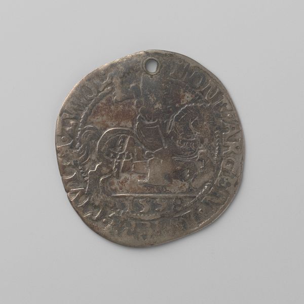This is a Gelderse tien stuiver, a coin made in 1606 by the Province of Gelderland. The coin presents a circular composition, its surface dominated by a figure in full armor. The figure stands rigidly, almost pressed into the coin's limited space, creating a tension between representation and physical form. Consider the semiotic weight of the armor. It is not merely protective gear but a signifier of power, status, and the ever-present potential for conflict. The lion emblazoned on the shield held by the figure further reinforces this semiotic load, acting as a heraldic symbol of the province and its martial strength. The coin's circular form contains and concentrates these symbols, suggesting an enclosed, self-referential system of meaning. Its limited dimensions, coupled with the density of its iconography, prompt questions about how such objects participate in the construction and circulation of value, both economic and symbolic, within a culture. The coin is not just currency; it is a condensed assertion of identity and authority, a token of power made palpable through design.