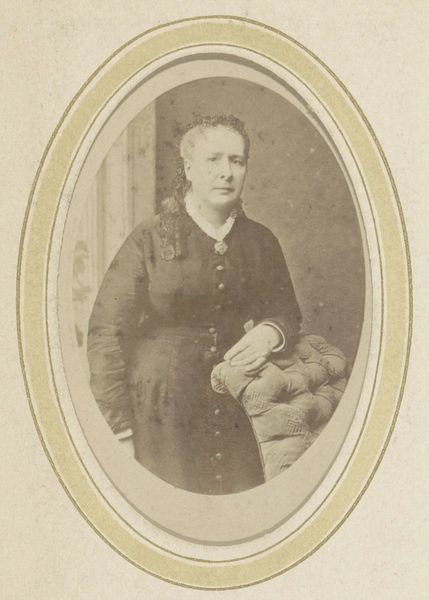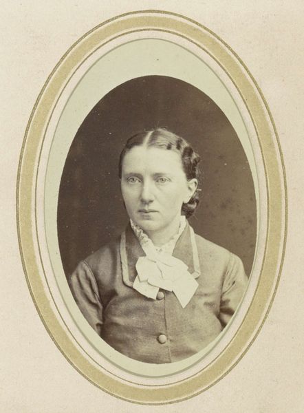 Editor: This is a photograph titled "Portrait of a Woman with a Bow, Referred to as Temmink," dating from around 1866 to 1900, attributed to Johan Christiaan Reesinck. The sepia tones give it such an antique feel. How do you approach something like this from a formalist perspective? Curator: Initially, observe how the ovoid frame immediately dictates the composition, centering the subject. The woman's face is the focal point, a study in light and shadow achieved through photographic techniques available at the time. Notice how the minimal tonal range directs your gaze? Editor: Yes, I see that, and the framing does keep the eye focused on her face. Is there a reason why the subject is always facing towards the right? Curator: Precisely. The subtle asymmetry creates a visual dynamic. We might also consider the material quality of the photograph itself - its texture and the way light reflects off the surface contribute to our understanding. Consider the crispness of the central figure contrasting with a softer quality towards the edge of the frame; this is typical for portrait photography of the period. It leads to speculation around the technical apparatus required and used. Editor: So it's less about who she *is* and more about how the photographer captured her likeness? What impact the light has on an eye, and how the choice to present that is impactful itself. Curator: Indeed. Our focus lies on dissecting the language of visuality: the choices made in composition, lighting, and framing. Editor: That's helpful. I was getting lost in wondering about her life, and now I see that understanding it in a purely technical manner helps with comprehension. Thank you! Curator: Of course. It allows us to move into any study more objectively with tangible understandings and observations.