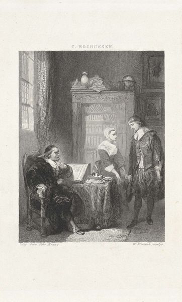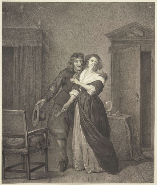 Curator: Robert Smirke, born in 1752, painted this scene from Bickerstaffe’s play ‘The Hypocrite,’ adapted from Colly Cibber’s ‘Non Juror.’ It’s part of the Tate collection. Editor: The color palette strikes me as muted, almost earthen. What materials did Smirke employ to achieve this effect? Curator: It's oil on canvas. The painting is interesting because it captures a specific moment in a play, which, itself, critiques social hypocrisy, mirroring the political anxieties of its time. Editor: I'm drawn to how the costume functions as a signifier of social status. The textures seem flat, almost deliberately denying any sense of opulence or excess. Curator: Exactly! The play, and Smirke's depiction, challenge the societal structures that promote such appearances. Editor: The emphasis on these costumes within such confined spaces suggests a critical awareness of how societal roles are constructed and performed. It is more than just a picture. Curator: A compelling glimpse into the material culture informing social critique. Editor: Indeed, and a reminder that even seemingly simple works can reveal complex layers of meaning.