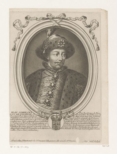 Curator: This is a print from sometime between 1642 and 1678 attributed to Nicolas de Larmessin, a portrait of Philip V, King of France. It's an engraving on toned paper, held here at the Rijksmuseum. Editor: Wow, that stare could cut glass. There's something intensely regal, almost melancholic, about his gaze. The oval frame makes me think of a cameo, but blown up and given this strangely detached vibe. Curator: The toning of the paper is fascinating. It serves not only to create depth and shadow but also speaks to the very historical context of this image. Prints like these would have been powerful tools for disseminating images of power and authority. We must remember France during that era was going through immense social upheaval, even with a king! Editor: Exactly, like carefully manufactured propaganda! Look at that ridiculously elaborate crown sitting on his hat! You have this guy, who I'm guessing was trying really hard to project strength, but instead looks a bit…preoccupied. Is it the weight of the crown, perhaps? Or something more… existential? Curator: We see depictions of royalty so often. What's striking to me about this work is the inscription; it reinforces the weight of lineage. It’s carefully inscribed around an ornate shield, itself teeming with symbolism. It underscores that the personal and political were thoroughly entangled during the Baroque period, especially with ideas about divine right. Editor: The detail is remarkable, especially the texture of the fabrics and that impressive chain. It makes me think of those old-school handmade valentines. Except instead of glitter and doilies, you have a king projecting power. But on a piece of toned paper. So, kind of fragile in the end, you know? A symbol, carefully manufactured. Curator: The scale is also essential to consider, how this small engraving could be reproduced and circulated, furthering an intersectional understanding about power, legacy, and the dissemination of idealized images. The portrait embodies a carefully constructed facade, as all portraiture in power is wont to do! Editor: Seeing it laid out so clearly really strips it down. It’s not about the man. It's about the machine behind him, whirring and grinding to preserve a dynasty. Well, that’s one conversation starter if ever I saw one.