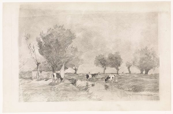 Cornelis Saftleven made this drawing, Bei einer Wiese Hütten unter Bäumen, vorne Herden, with graphite on paper. The marks are spare and casual, but the economy of means contributes to the drawing’s overall success. Saftleven has captured a scene of rural life. It’s a pastoral landscape, with farmhouses and grazing animals. The artist was clearly attentive to the material reality of the scene, but he has also captured a sense of daily life. This approach to subject matter can be read as reflecting the social context of the time. The Dutch Golden Age, and a growing interest in the everyday lives of ordinary people. Drawings like this reflect a shift away from the idealized, classical landscapes of earlier art. Instead, Saftleven is interested in capturing the texture and feel of a real place. The drawing is a testament to the value of careful observation and attention to the world around us. By focusing on the material reality of the scene, Saftleven has created a work that is both beautiful and meaningful.