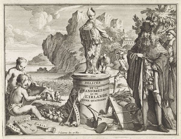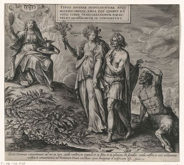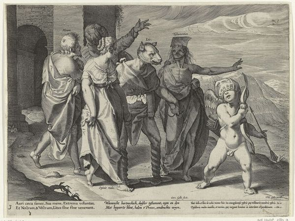 Curator: Welcome to the Rijksmuseum. Today we’re exploring "Christelijke ridder," an engraving by Pieter Serwouters from 1614. It's a dense allegorical piece, a real product of its time. Editor: It strikes me immediately as a very busy composition. There's so much vying for my attention, visually—it has the chaotic, almost nightmarish quality that sometimes pervades baroque art. What should the eye focus on first? Curator: Perhaps the central figure of the Christian knight, clad in elaborate armor, atop a fractured base. He's flanked by a woman in fine dress and... a devil aiming a bow and arrow. It is an engraving after all so its success rests solely on the lines he was able to engrave using a burin and other metal tools to scrape, cut, and burnish lines in a metal plate. This shows the amount of manual labour required by such craft, but it's so easy to disregard that the work would be more involved and painstaking than more highbrow types of artistic production. Editor: The materiality, the making, is fascinating! But back to the content, isn't he being offered a cup from the female figure? It suggests an interesting juxtaposition of virtue and vice. Also, above him floats a wreath. Curator: Precisely! The cup symbolizes honor, the wreath, victory, as he is tempted by earthly riches, you can tell by the coin bag at her feet. However, he also resists the threat represented by the demonic figure’s arrow – a symbol of temptation or sin. What intrigues me are the carefully composed allegorical relationships, like those ruins representing decay beneath his feet that underscore themes about faith. Editor: Seeing it from a context of material production really emphasizes this kind of image-making and reminds us about the sociohistorical circumstances. In other words, thinking about Serwouters, you need to start appreciating these things! Curator: True, that’s the complexity of baroque imagery! I walk away with the rich symbolism intertwined with its skillful engraving. It presents many compelling facets in its philosophical themes about morality.