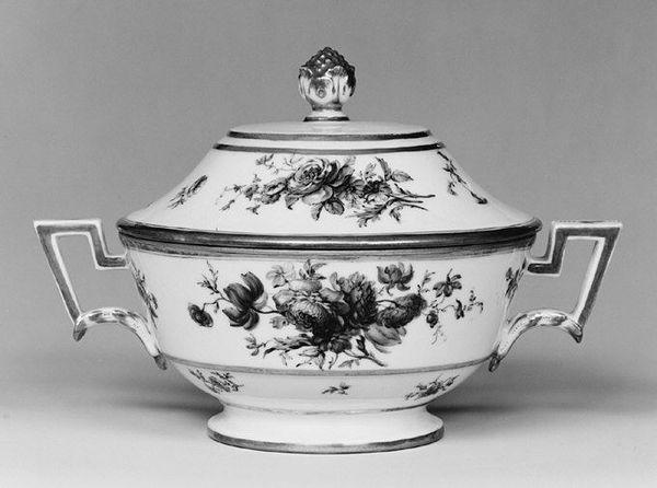 This tureen with a cover was created by Niderviller sometime in the 18th century out of faience. It's characterized by flowing, organic shapes and balanced symmetry, which invite immediate aesthetic appreciation. Let's delve into its structure. Notice how the floral designs aren't merely decorative; they dictate the visual rhythm, guiding our eyes across the surface, from the handles to the finial. The handles and four feet provide stability, grounding the piece while the cover mirrors the curvature of the base, creating a harmonious visual echo. The strategic use of negative space highlights the delicate forms of the flowers and birds, each element carefully placed to maximize visual impact and create a sense of depth and complexity. The subtle asymmetry of the floral patterns, especially on the cover, disrupts perfect symmetry, suggesting a dynamic, evolving order rather than a static one. Consider how this interplay of form and function reflects broader philosophical concerns about nature and artifice. The tureen is not just a vessel but a carefully constructed object that blurs the lines between the natural and the created.
