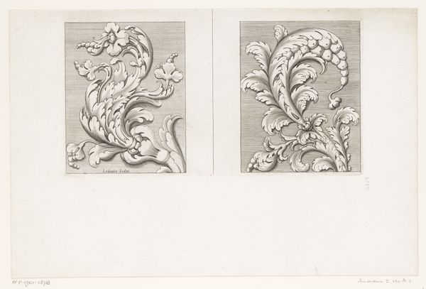 These ‘Vier rocaille schilden,’ or Four Rocaille Shields, are rendered in an anonymous drawing. The composition is defined by four distinct cartouches, each meticulously crafted with a dual presentation: one half showcases the skeletal framework, the other, the completed design. Lines are carefully constructed to highlight structure and form, while the contrast between the finished and unfinished sides offers a view into the design process. The rocaille style, known for its ornate and asymmetrical forms, plays with notions of balance and harmony. The shields might symbolize protection and status, yet their incomplete rendering introduces an element of impermanence or possibility. Consider the implications of these shields, caught between concept and completion, as they invite reflection on the cultural codes of decoration and representation.