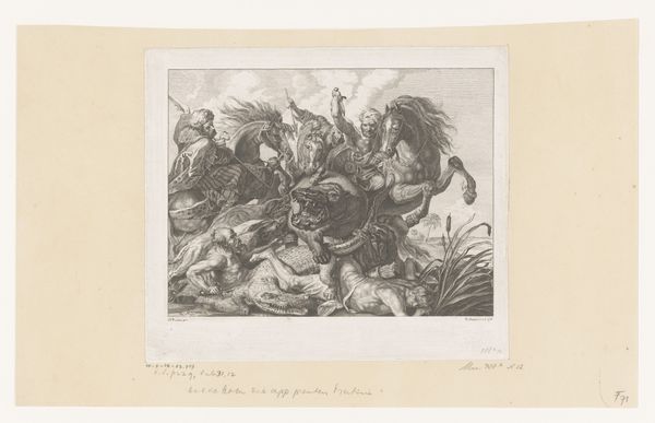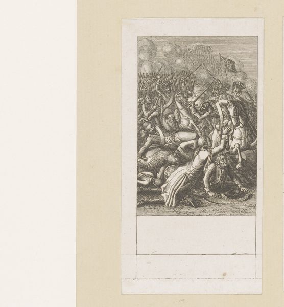 Daniel Nikolaus Chodowiecki made this etching, "Cossacks, Hussars and Cuirassiers in Battle," around the late 18th century. Etching is an intaglio printmaking technique, where a metal plate, usually copper or zinc, is covered with a waxy ground. The artist then scratches an image into the ground with a pointed tool, exposing the metal. The plate is then immersed in acid, which bites into the exposed lines, creating grooves. The entire plate is inked and then wiped clean, leaving ink only in the etched grooves. Finally, the plate is pressed onto paper, transferring the ink and creating the print. The etched lines give the image a distinctive quality, a sense of immediacy, as if rapidly drawn. This aesthetic was in high demand in the 18th century, as images like this one circulated widely. So, the print participates both in a tradition of fine art and a broader culture of illustration.