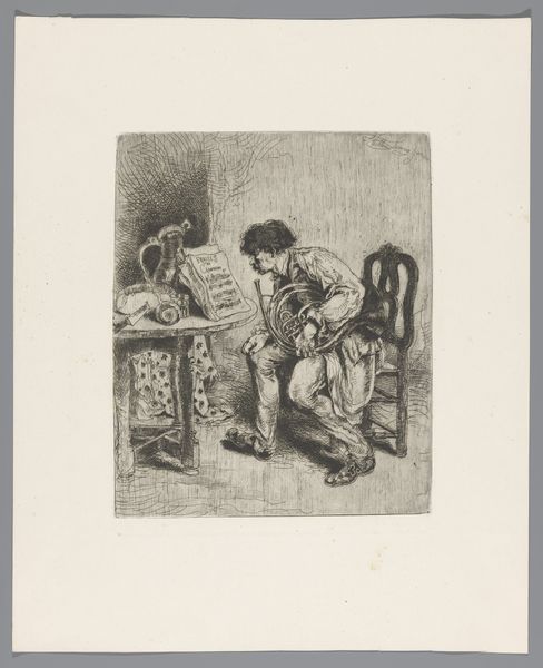 Curator: This etching by Willem Linnig the Younger, likely created sometime between 1852 and 1890, is intriguingly titled "Hoornist bestudeert de bladmuziek Fraises au Champagne" which translates to "Horn Player Studying the Sheet Music Strawberries with Champagne." It's currently held at the Rijksmuseum. Editor: The print has an incredibly intimate feel; it's muted, the man focused and a bit scruffy. You can almost feel the struggle with the instrument or perhaps even the music itself. It looks rather humble. Curator: Indeed. And placing this work within the context of 19th-century art institutions and societal expectations helps illuminate it. It falls neatly into the genre painting tradition while incorporating realist principles, documenting ordinary life outside academic themes. The subject isn't some idealized hero or historical figure but simply a musician practicing. How might this imagery play into the development of a bourgeoisie-defined public role of art? Editor: That is an interesting connection. I find it also noteworthy that Linnig includes what appears to be “Fraises au Champagne,” implying a complex relationship between artistic practice, economic precarity and access to luxuries represented through the music score. One could imagine how concepts such as leisure, class identity and male artistic roles are being negotiated through imagery in the print itself. It opens the question of access and labor when we talk about cultural consumption in the 19th century. Curator: And consider that music at that time was inextricably linked with social mobility and status. Perhaps Linnig critiques through such seemingly innocent rendering. This tension between realism and aspirational subject matter deserves some focus given the piece’s original exhibition space and socio-political landscape. Was it trying to be rebellious, satirical, or simply observe everyday life? Editor: The printmaking method adds another layer. This artwork’s wider distribution challenges artistic exclusivity as audiences grew and print reproduction methods facilitated art accessibility beyond private wealthy collectors. Its location today in the Rijksmuseum ensures continual dialogues about its narrative continue among a much wider range of museum attendees today. Curator: It also lets us engage with Linnig’s aesthetic preferences and intentions anew. Its subdued tones, subject focus, combined with music associations spark reflection on status, aspiration, access and art’s purpose. Editor: The socio-economic analysis combined with this visual reading allows us richer contemplation of the historical context, indeed!