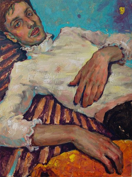 Curator: Alexander Roitburd, a major figure in Ukrainian art, painted "Arrest of the Propagandist" in 2009. It’s oil and acrylic on canvas. Editor: My immediate reaction is…dizzying. There’s a fallen figure, an overturned clock, a giant beetle. The texture of the paint is very thick, very expressive. There is something unsettling. Curator: Absolutely. It’s Roitburd reflecting on the power of narrative and how easily it can be toppled. I find a subtle, sly humor even in his darkest works. It's like he’s saying, "Yes, things are absurd, but aren’t they also fascinating?" Editor: Yes, and that overturned clock – he’s playing with temporality. Time’s disrupted, maybe narrative itself is shattered. It creates a visually jarring composition: a very classical and rather formal central element-- the man, is made grotesque by this monstrous insect. What does the green of the bug bring to the image, aside from this ghastly feeling of unease? Curator: I always thought it was meant to evoke decay. The colour of decomposition but on this almost regal creature…almost ironic as an attribute to the central fallen figure in the composition. It is so heavy with symbolism and emotional heft but still feels accessible, immediate in the expression. It almost doesn’t need ‘decoding.’ It hits you right in the gut. Editor: Precisely, Roitburd makes sure that his symbolic vocabulary hits your body. He uses recognizable visual symbols, especially in terms of spatial construction but defamiliarises them to make them disturbing, like some kind of theatrical drama unfolding in one's mind! And there’s such depth of feeling embedded in that impasto, as if, perhaps the artist’s very psyche were worked into the material. Curator: Right, it invites us to feel deeply, think critically, and laugh, even when we are uncomfortable. Editor: This invites some consideration of my own pre-conceived notions. I shall leave here and go buy a green bug immediately. Thank you for your analysis.