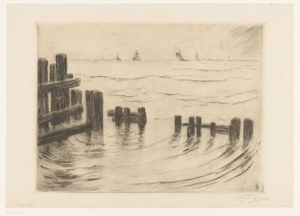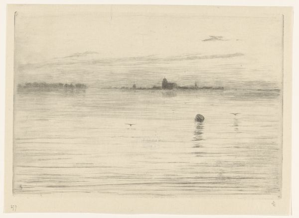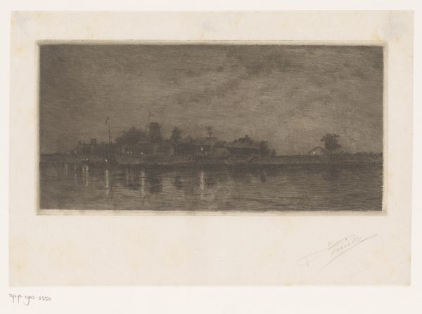 Curator: This etching, created between 1880 and 1884, offers us Carel Nicolaas Storm van 's-Gravesande's "View of Dordrecht at Evening." Editor: Ah, so instantly moody, isn't it? Like a hushed secret whispered across the water. The greyscale really amplifies the sense of melancholy, that quiet, almost desolate feeling of twilight. Curator: Indeed. Note the Impressionistic style, where capturing a transient moment of light and atmosphere takes precedence over precise detail. What could these misty waterfront cities have meant to late 19th-century audiences? What enduring visual elements have these cityscapes imprinted on the cultural memory? Editor: It's all about feeling, isn't it? I keep wanting to put on a really long wool coat, smoke a pipe, and brood constructively. The hazy city in the background is softened to a blurred strip on the horizon by the setting sunlight or rising mist—and what kind of visual tropes do you think that activates in a person's heart? I see an archetype; the romantic traveler perhaps? Or, perhaps it reflects our current concern, this dissolving atmosphere—maybe it can serve as a cautionary sign? Curator: Perhaps so. It captures a specific aesthetic—but perhaps, to you, even a certain... longing. Also consider the visual weight given to the harbor lamp. You could say it’s a guiding light, an ever-present reminder, but I am prompted to remember a quote by Carl Jung: “I am not what happened to me, I am what I choose to become." Editor: Oh, wow. So that little light on the water can prompt a personal narrative? Right, right—I mean, that touches on a real need to interpret symbols to try and work things out on a fundamental level, a Jungian thing. What choices did van 's-Gravesande consider, do you suppose? I mean, beyond printing plates and inking? Curator: I would hazard that, through subject, style, and composition, he chose a timeless language to connect with human sentiments. To tap into shared memories of nature's influence, progress, and time itself. Editor: Agreed. And now I need to go read some Baudelaire while staring pensively out of a window. Thanks for helping me see all the psychological echoes there.