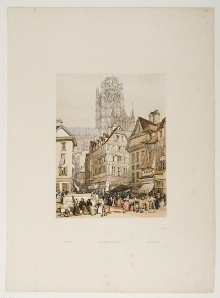 Editor: This etching, "Cathedral, Abbeville," by John Coney, presents a bustling scene dominated by a towering cathedral. The figures seem so small. What does this cathedral represent to you? Curator: Cathedrals carry centuries of cultural and spiritual significance. Notice how Coney uses the cathedral as a backdrop, its imposing height acting as a constant reminder of faith. It's a symbol, a visual anchor connecting the everyday lives of the people in the foreground to something eternal. Editor: So, the cathedral almost serves as a cultural memory, constantly present? Curator: Precisely. It's a form of visual storytelling, linking the present to a rich, often complex past. Coney uses scale to evoke the weight of history and belief. Do you feel that connection? Editor: I do now. It's a powerful symbol. Curator: Indeed. It shows how symbols continue to shape our perceptions.