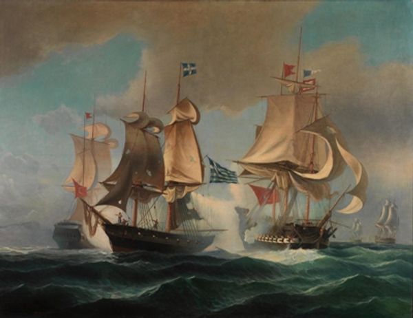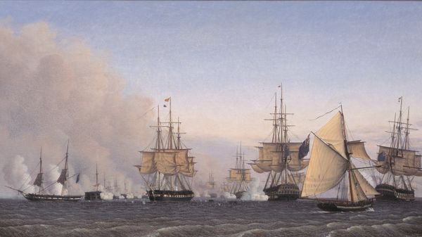 Curator: Standing before us is "English Warships at Sea in a Fresh Breeze" by Jan Karel Donatus van Beecq, painted in 1677. This oil painting currently resides here at the SMK, the Statens Museum for Kunst. Editor: Oh, instantly, the drama! It’s that blustery light and the grey-green sea, tossing those enormous warships about like toys. There’s a strange beauty, though. Curator: Absolutely. It captures the age of sail with its own peculiar visual language. Notice how the flags are not just decorative; they are vital signs, declaring the ships' allegiance. The flags, particularly, were part of this visual theater of power. Editor: Theatre is right. They are these floating fortresses of national pride and ambition. But it all seems so fragile with all that wind and water. Look at that lead warship: dark, menacing. Reminds me of a storm cloud. Curator: Indeed, these are powerful symbols intertwined with a potent psychological impact. Warships served not merely as tools of conflict but as visual emblems of a nation’s prestige and dominance. What this work speaks to for me is also cultural memory – the continued power naval strength had in the visual and cultural imagination. Editor: It is wild, picturing the lives onboard, all that work and risk crammed into a floating box. They’re so grand, yet so utterly at the mercy of nature. I think this painter has found something special in that dichotomy. A reminder of our limits. Curator: Indeed, a tension embodied through symbols of national power in concert with, and opposition to, the natural world, so vital to our collective identities even now. It highlights an enduring continuity between human ambition and nature’s capricious spirit. Editor: That kind of mirrors my earlier gut feeling: there’s more than pomposity here. There's just something beautifully humbling about it all. Curator: Thank you for pointing that out; this work now leaves me thinking of how fleeting this particular iteration of maritime power was, and how other nations have risen to take its place on the water stage.