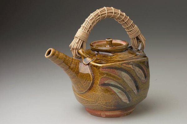Curator: Allow me to introduce a fascinating example of American ceramics, a covered sugar bowl produced by Ott and Brewer between 1876 and 1883. Editor: It’s lovely! It evokes such a delicate, almost precious feeling. The subdued palette with hints of gold give it a wonderfully refined appearance. Curator: The refined appearance comes through the construction, doesn't it? Notice the meticulous detailing in the ceramic and earthenware. The exterior is crafted with careful attention to texture and shape. Its body has this sort of basket-weave effect in relief, over which the stylized motifs of aquatic plants and grasses have been painted in metallic pigments. Editor: It feels evocative of the aesthetic interests popular at the time, doesn’t it? We should recall that sugar bowls like this one functioned within elaborate rituals of social class. Serving and consuming sugar was increasingly embedded with social, economic, and even colonial power dynamics of the era. How might this object be viewed in relation to the Opium Wars or the rise of sugar plantations and slavery? Curator: The form itself also presents a rather interesting geometry. The bulbous shape, combined with its handles, offers a balance between the utilitarian and the ornamental. Consider how each element contributes to a harmonious, albeit symmetrical design. The lid with its finial continues that perfect repetition, making for a cohesive structure. Editor: But looking closer at the ornamentation, are we also not meant to see the symbolism inherent in the chosen motifs? The stylized plants, probably meant to depict cat tails and perhaps lily pads, suggest an idealized vision of nature – divorced, naturally, from the exploitation that enabled its creation for consumers in America. This domestic object sits at a crossroads of beauty, power, and commerce. Curator: A nexus indeed! The quality of the craftsmanship certainly underscores an interest in artistic merit, beyond mere utility, indicating perhaps the maker’s aspirations toward elevated design standards. Editor: Precisely! An artifact reflecting aspirations, as well as realities—it is precisely this tension which renders pieces like this eternally interesting. Thank you for directing our gaze, today.