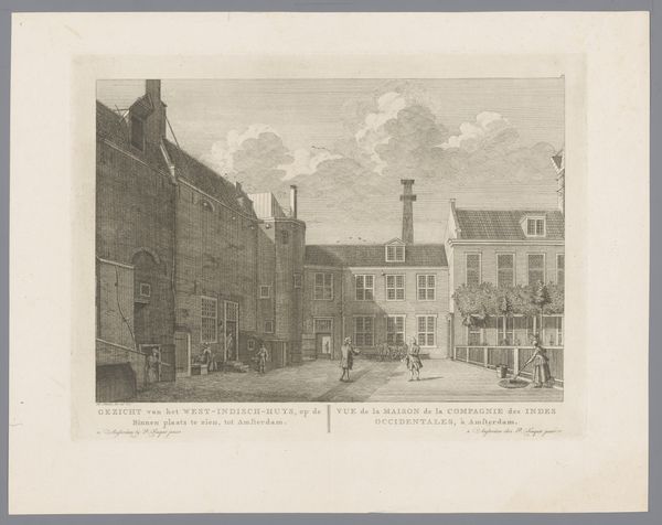 Curator: There's a haunting stillness to this print, a quality achieved so delicately using line engraving. The artwork is titled *Gezicht op de Derde Regulierspoort in Amsterdam*. Editor: It feels melancholic, almost… sepia-toned even though it's black and white. Like a memory fading at the edges. Curator: It dates back to 1663 and the artist is, sadly, anonymous, leaving us to wonder who captured this intimate glimpse of Amsterdam life, now housed at the Rijksmuseum. I love how this print evokes a strong sense of architectural presence but somehow, is even more powerful as a reflection of the time and its cultural milieu. Editor: Indeed. Looking closely, it's hard not to think about the social stratification inherent in such cityscapes. The grand architecture frames smaller figures. What lives transpired inside and outside those walls and who benefited from those structures? Curator: Yes, there is a wonderful contradiction here; this image feels timeless but undeniably rooted in its specific moment. You have merchants in fine clothes entering through the city gate, but the street cleaners in their modest tunics stay to the side; it is impossible not to read some social commentary here, whether intentional or not. Editor: Right. And what does it mean to document a gate? Gates, after all, are points of control, passage, and exclusion. Who gets in, who stays out and for what reason? The single wisp of smoke feels so weighted, an omen of things to come as well as a simple statement about domestic life. Curator: In art school, they teach you that every line counts; this unknown engraver makes you believe it! But let’s not get lost in social conjecture, what stays with me, beyond historical musings, is the beautiful evocation of atmosphere using purely line and tone. What lingers in your mind? Editor: It underscores, to me, that any street scene from the past is really a coded narrative, speaking to systems of power as much as to daily rhythms. I might want to consider the implications of such places; access and denial… Curator: Well, regardless of where we stand, politically speaking, the artistic finesse embedded here is simply timeless, is it not? Editor: It is undeniable that its very existence provides a starting point from which to consider wider societal issues.