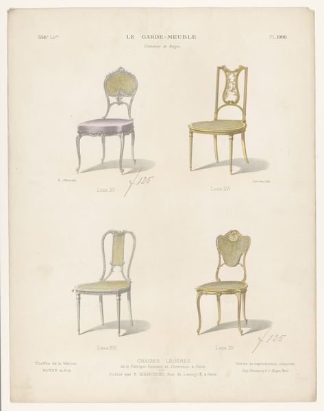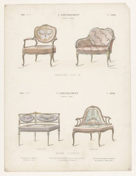 Here we see "Canapé", a print by Léon Laroche showing chair designs from "Le Garde-Meuble". The Louis XVI style is prominently featured, distinguished by its regal motifs. Note the repeated use of oval shapes and vertical lines. These design elements aren't merely decorative; they echo forms found in classical architecture, symbolizing stability and order. Consider the chair on the top left, adorned with what appears to be a fleur-de-lis. This symbol, historically linked to French royalty, speaks to a lineage of power and authority. Interestingly, the fleur-de-lis has roots stretching back millennia, appearing in various cultures as symbols of purity, light, and even divinity. Its adoption by French monarchs marked a specific claim to divine right, an idea deeply embedded in the collective psyche. This appropriation and transformation of symbols is a fascinating phenomenon. It reveals how cultural memory, deeply embedded in our subconscious, can shape visual language across time. The emotional resonance of these symbols, connecting us to a distant yet familiar past, exerts a powerful force on our perceptions. Thus, these chairs are not just furniture, but vessels carrying layers of history and meaning.