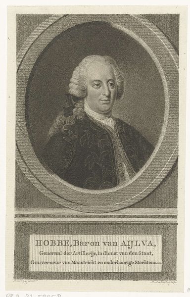 This is an engraving of Willem Frans Godard van Lynden tot Hemmen, made by Jacob Houbraken in 1776. The image is created through a process of incising lines onto a metal plate, inking the plate, and then pressing it onto paper. The real skill here resides in the engraver’s hand: the way the lines are weighted and grouped creates a sense of volume and texture. It's a labor-intensive technique, demanding both precision and artistry. The engraver has not only captured a likeness, but also something of the sitter’s social standing. Engravings like this were often made as reproductive prints, circulating images and ideas widely. In this case, we see how printmaking technology allowed for the dissemination of portraits beyond the circles of the wealthy elite. It's a fascinating intersection of craft, portraiture, and the burgeoning world of mass media.