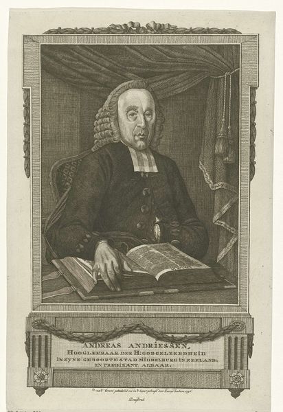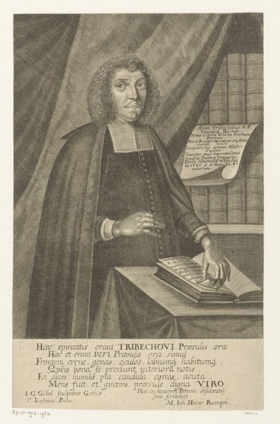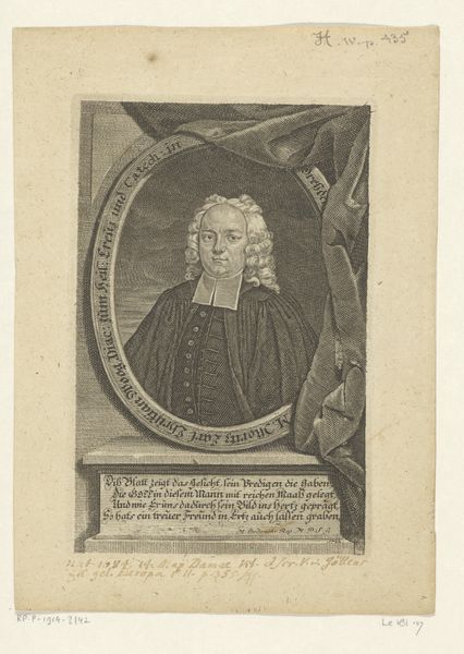 Editor: This print, "Portret van Johann Caspar Schade," by Johann David Schleuen, created sometime between 1721 and 1771, depicts a stern-looking man surrounded by books and draped fabric. It has such a formal, almost academic air to it. What sociopolitical dynamics do you see represented here? Curator: What strikes me is the tension between the visual signifiers of power and the inscribed texts surrounding Schade. Consider the books, suggesting intellectual authority, juxtaposed with the Baroque drapery, signaling wealth and status. But what happens when we delve into the text, the identity claims inscribed? It speaks to "labour and prayer" as having aged him – what work is obscured in this account? Whose labor afforded Schade leisure time to write, to be educated? Editor: That’s interesting. So, you’re saying it's a portrait that actively obscures the social conditions that allowed this man to be portrayed in such a way? Curator: Precisely. It performs power but also hints at underlying structures of inequality. Think about printmaking itself. It democratized images, yes, but it also replicated hierarchies and the narratives those in power wanted circulated. Who was this print for, and what purpose did it serve? Consider this an argument or advertisement— for whom and why? Editor: So, analyzing the visual elements and the text gives us a fuller, more critical understanding of the social realities of the time, not just a surface-level portrait. I never would have considered that. Curator: Exactly! Art provides an opportunity to not just observe history, but question its very construction and the underlying power dynamics in play. Editor: That’s a new way of thinking about art for me, I’ll keep this in mind.