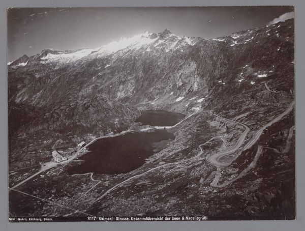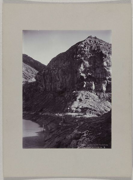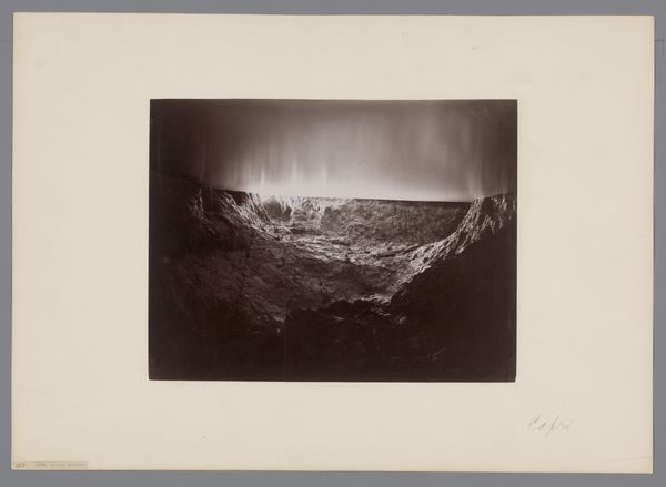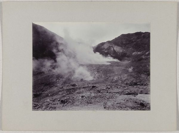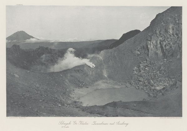 Editor: This black and white print, dating roughly from 1895 to 1915, depicts the "Kratermeer op het Idjen Plateau, Java, Nederlands-Indië" by Onnes Kurkdjian. It’s incredibly striking - the desolate landscape evokes a sense of isolation. What do you see in this piece? Curator: Immediately, the stark contrast pulls me in. Light and dark aren't just visual elements; they carry symbolic weight. The volcano's form, a 'source' for life and also a 'force' for destruction, becomes a profound archetype. The photograph captures this tension so well; a powerful image. Do you see the symbolism in the plumes of smoke? Editor: Well, I guess it represents activity and latent power? Curator: Exactly. Throughout history, smoke has represented transformation and communication. It also reminds us that nature possesses immense power, influencing and dictating human lives in that specific geography and also worldwide, considering its environmental impact. There is also a vertical element, which suggests a kind of implied divinity; do you agree? Editor: That’s interesting, I hadn’t considered a divine aspect. Now that you mention it, the framing does seem to emphasize that upward thrust. Curator: What could be, for our contemporary minds, its implications concerning collective memory? Editor: Perhaps this connects to how societies throughout time have remembered significant natural events and integrated them into mythologies or cultural beliefs, preserving those memories and teaching important symbolic lessons across generations. Curator: Precisely! And maybe that shared memory is something photography helps cultivate as well. Editor: This really makes me see the photo differently now, thinking about it in terms of long-lasting impact and shared symbols. Curator: Indeed, this type of artwork serves as an important visual repository of culture, history, memory, and collective imagination.