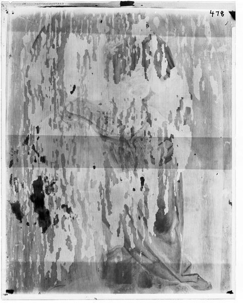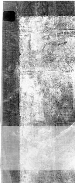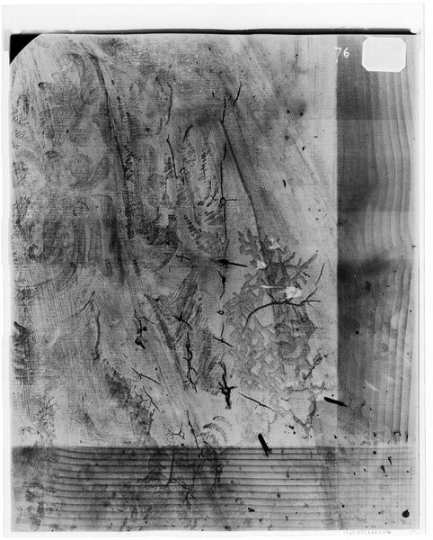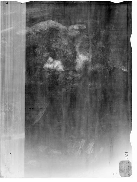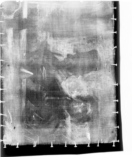 Editor: This is an X-radiograph of Giovanni Battista Tiepolo’s "Christ at Emmaus". The stark contrast between light and shadow is fascinating. What formal elements stand out to you? Curator: Observe the layered composition. The radiography reveals not only the final painted surface, but also the artist's process. Note the distribution of density, signifying the presence and concentration of pigment. Editor: So the areas of high density indicate where Tiepolo applied more paint? Curator: Precisely. Consider how this layering and density contribute to the overall structure and form. The artist's hand is present not only on the surface, but also within the depths of the painting. Editor: It's like a glimpse into the artistic process itself. Thanks, that’s insightful. Curator: Indeed. It encourages a deeper appreciation of Tiepolo’s technique and his understanding of light and form.
