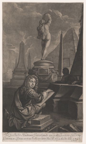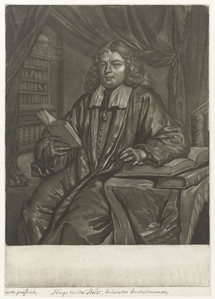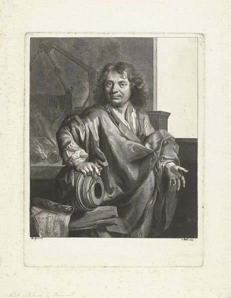Curator: This ink and pen drawing by Jan Verkolje I, created sometime between 1660 and 1693, depicts "Portret van Hugo van der Helst, staand in zijn bibliotheek"—a portrait of Hugo van der Helst standing in his library. Editor: My first thought is how delicate it is, almost ghostly. The lines are so fine, and the wash gives it a muted, ethereal quality. It’s interesting to see a portrait in what is clearly a domestic, intellectual space. Curator: Exactly! We see Van der Helst not just as a subject of status, but within his world of books. These interior scenes reveal a shift in patronage during the Dutch Golden Age, reflecting a growing merchant class interested in depicting themselves within their achieved spaces. Look at the drape of his garment, and the texture achieved with simple washes, this is really quite compelling artisanship on display. Editor: It's intriguing to see how Verkolje uses line and wash. You can almost feel the texture of the paper. I wonder how the materiality of the ink and paper would have influenced its reception at the time. These were precious goods representing new production chains in Europe. Curator: Certainly! And consider the accessibility. While oil paintings were for wealthier patrons, drawings offered a more affordable alternative. It’s fascinating how pen and ink elevated themselves into acceptable mediums for high art. This image suggests a democratisation of art viewership and consumption, and how artistic labor becomes a question of artisanal skill versus academic talent. Editor: You are right, and the library behind him is fascinating—a symbol of status, learning, and intellectual prowess readily accessible through wider publishing networks. The book on which he rests his hand seems like a material manifestation of these same things. Curator: The presentation of van der Helst, draped in what could be interpreted as scholarly robes, is also strategic—implying education, wealth, and cultivated taste to the patron, it signals that Van der Helst wants to portray himself within this lineage of successful people and cultivated elites. Editor: Absolutely. Verkolje positions his client to the burgeoning self-made public as a powerful consumer good. I see the drawing, ultimately, as an object entangled within emerging networks of artistic production, commerce, and class presentation of its time. Curator: And through close examination, we can really explore and better understand both the image and the means and context behind its production. Editor: It is amazing what simple materiality reveals about society!