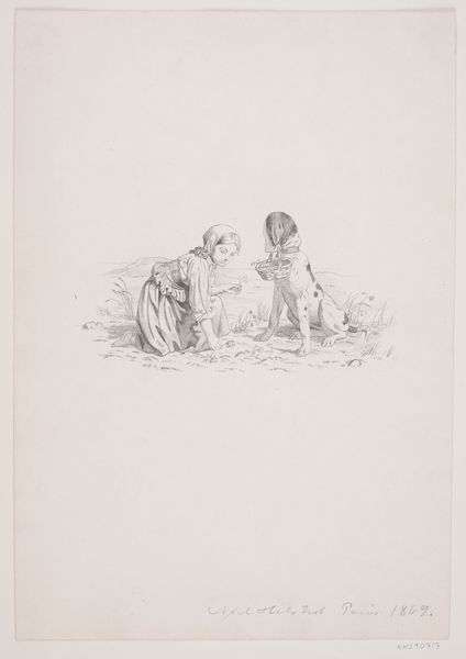 Editor: Here we have "Holy Family? with Angels l.1: The March of the Intellect", a 19th-century drawing and print, probably a pencil and etching. I am really struck by the sketch-like quality and ethereal nature. What catches your eye when you examine this artwork? Curator: The composition is paramount. Notice the artist’s strategic use of line and shadow to define form. The figures are clustered, creating a sense of intimacy and unity, but rendered with an interesting minimal economy. Do you observe the delicate balance between the densely worked central group and the relatively blank space surrounding them? Editor: Yes, the emptiness definitely emphasizes the huddle of bodies in the center. The angel on the left seems barely there. Why do you think the artist left so much negative space? Curator: The void may serve multiple functions. It could highlight the central group, directing the viewer's focus and emphasizing the family unit. Moreover, the sparse details and faint outlines might convey a sense of the otherworldly or transcendent, consistent with the holy subject. How does the texture and materiality, the etched line quality and layering, influence your experience? Editor: I think the lightness and almost faded quality makes it feel like a memory, not quite solid. It has an ambiguous quality, which the question mark in the title mirrors. The form suggests an iconographic depiction but does not fully commit. Curator: Precisely. The artist teases our expectations, creating a productive tension between familiarity and uncertainty. Through careful control of line and form, they engender thoughtful contemplation. Editor: That’s a different approach to reading a drawing like this; thinking of it less as a symbolic story, and more about its artistic qualities like space and composition, really changes my understanding of it. Curator: Indeed. It reframes the dialogue, shifting emphasis from narrative content to the intrinsic language of art.