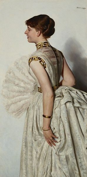 Editor: This is Romualdo Locatelli's "Portrait of Ida Banfi," created in 1937. It's an oil painting, and the figure just seems to float in a wash of greens and browns. What strikes you about this work? Curator: Oh, Ida! To me, she embodies a whispered elegance. Her soft smile feels intimate, like she's sharing a secret with the viewer. But what is she holding onto with her right hand? The fabric drapes with this very studied look as if trying to create or follow some rule of draping fabric, which always gets me. It’s like she's caught between worlds - the shimmering society she inhabits, maybe? What do you feel about it? Editor: I hadn't really considered the folds of her dress or her holding it… but it’s really an invitation to follow the lines of the fabric, right? Curator: Exactly! Look how it guides the eye up her figure, leading you back to that enigmatic smile. Locatelli was a master of suggestion; a lot of his paintings I have encountered convey a narrative but rarely a defined one. This is not realism, which feels almost voyeuristic to me; this portrait seems more personal, more dreamlike. I almost expect the green background to dissolve around her. Editor: So it's not just a picture of someone, but a capture of an emotional state or moment in time? Curator: Precisely! And consider when it was painted - 1937. Europe was teetering on the edge of war. Perhaps this painting is meant to preserve some form of gentleness and peace of mind as everything changed. How striking! Editor: That adds a whole new layer, doesn't it? It makes her serenity more poignant. Thanks for sharing! Curator: My pleasure! Every piece of art tells a story if you listen closely and it seems like you really picked that up.